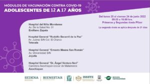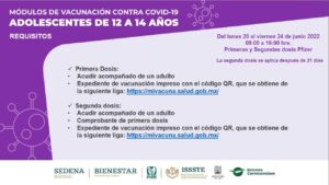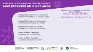 Autoridades federales y estatales mantienen activo el Plan Nacional de Vacunación contra COVID-19, dirigido a menores de 12 a 17 años de edad, a quienes se les aplicará primeras y segundas dosis Pfizer, del lunes 20 al viernes 24 de junio del 2022, en un horario de 09:00 a 16:00 horas.