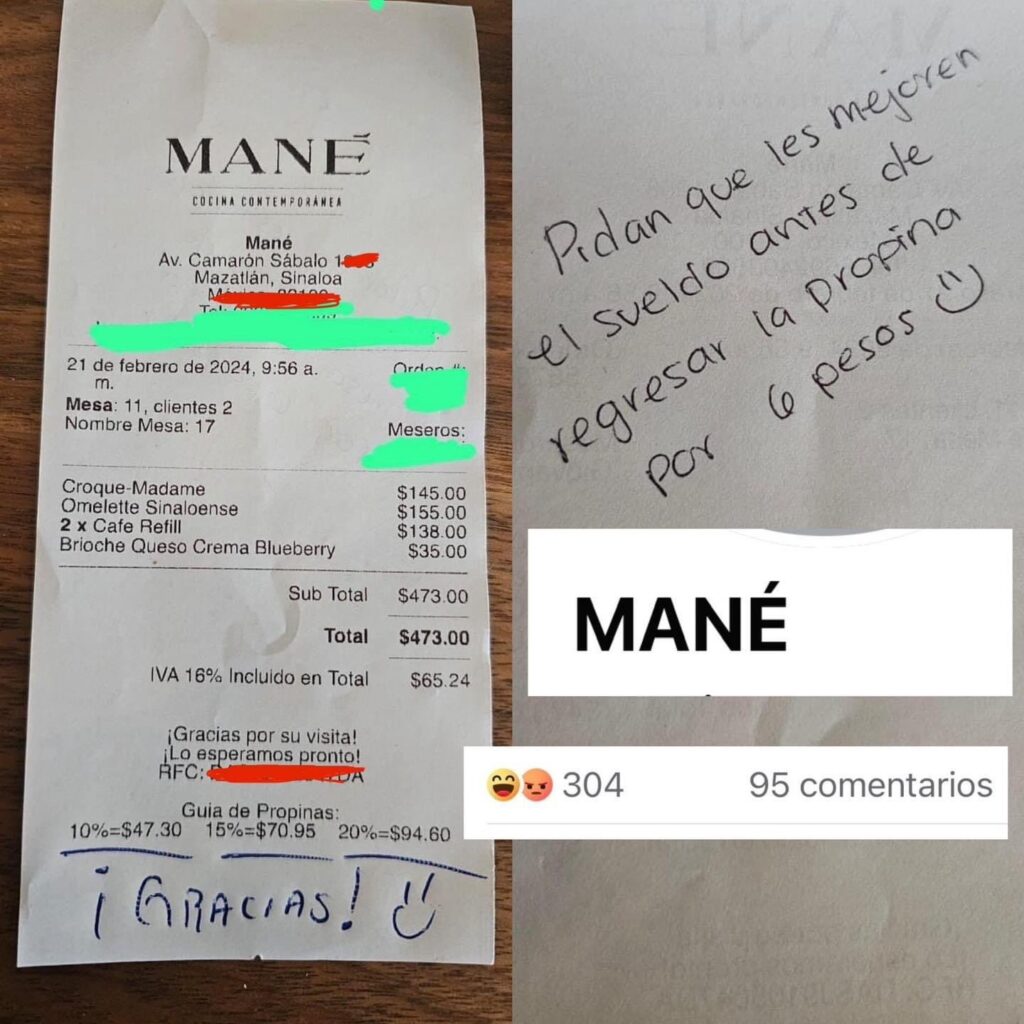 En Mazatlán, Sinaloa, se produjo un incidente peculiar en el que un mesero devolvió una propina a un cliente porque esta no alcanzaba el porcentaje sugerido. Según lo que se ha difundido en redes sociales, al mesero le molestó que la propina no llegara exactamente al 10%, sino que estuviera 6 pesos por debajo, por lo que optó por rechazarla.