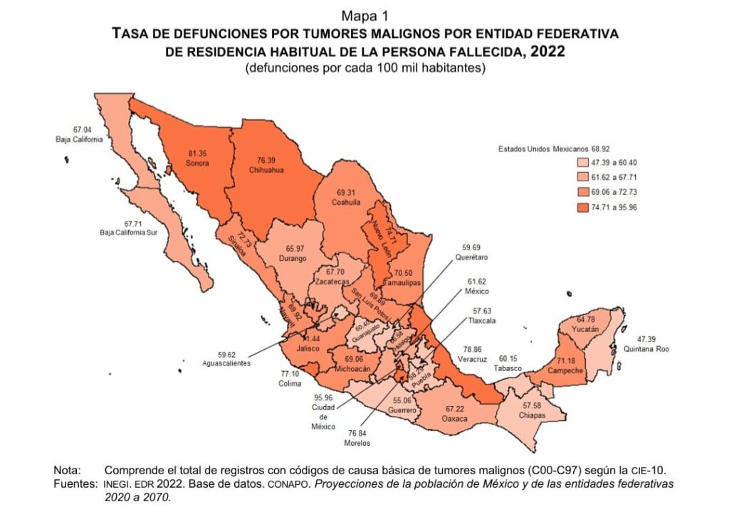 En ese año, las entidades federativas que registraron las tasas más altas de defunciones por tumores malignos fueron: Ciudad de México, Sonora, Veracruz de Ignacio de la Llave, Colima, Morelos y Chihuahua, con tasas de 76.39 a 95.96 defunciones por cada 100 mil habitantes.