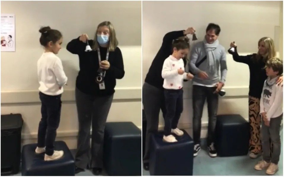 En la grabación se muestra el momento en que toda la familia se reúne para festejar con la menor. En la escena se puede ver el conmovedor ritual que llevan adelante los pacientes que logran superar la enfermedad: tocan tres veces una campana para celebrar la vida.