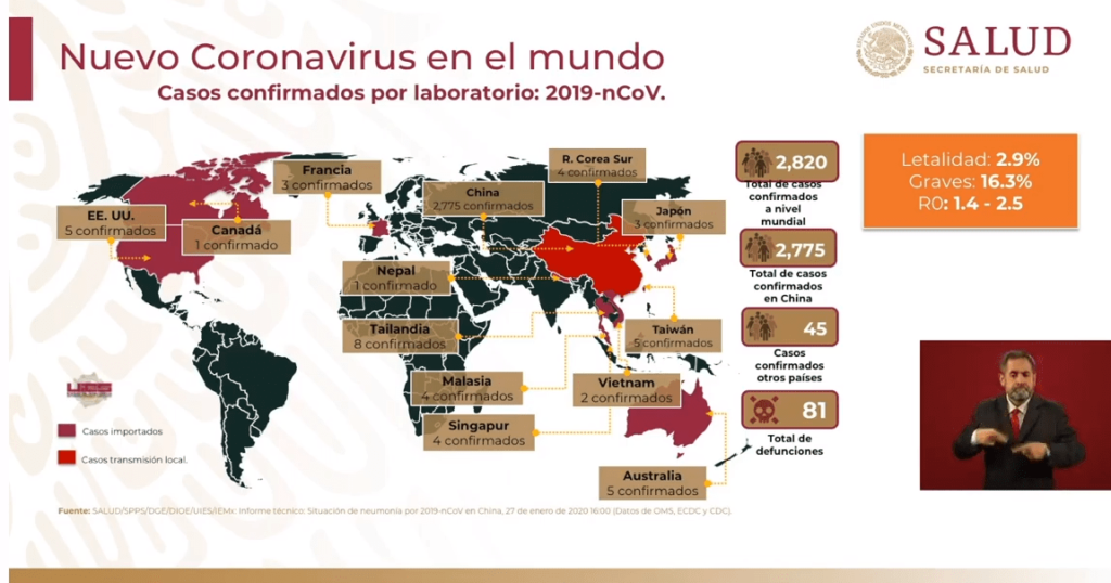 Señaló que se han confirmado 2 mil 820 casos de infectados con coronavirus a nivel mundial, en 13 países. La mayoría de los enfermos se concentra en China, donde reportan 2 mil 775 casos. Hasta la noche del lunes, habían fallecido 81 personas.