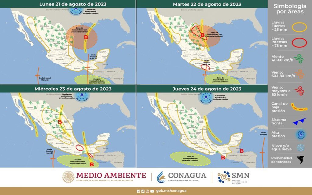 Autoridades emitieron la perspectiva meteorológica referente a las condiciones climatológicas para el periodo 21 al 24 de agosto, en el que se prevé tiempo inestable, cielo nublado y alta probabilidad de lluvia durante la noche, en cuanto a las temperaturas, continuarán siendo cálidas y hasta calurosas.