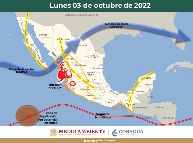 Los efectos y posibles remanentes de “Orlene” se dispersarán sobre gran parte de la República Mexicana, incrementando el potencial lluvioso sobre estados del occidente y centro-norte del país, principalmente, alcanzando también parte del oriente.
