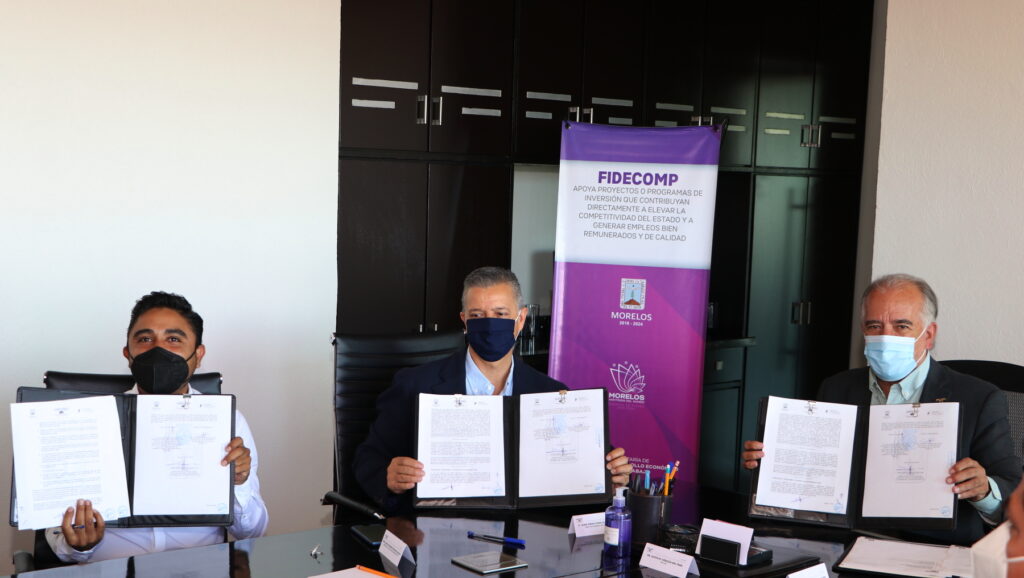 El rector de la Universidad Autónoma del Estado de Morelos (UAEM), Gustavo Urquiza Beltrán y el director de la Facultad de Arquitectura, Adolfo Saldívar Cazales, realizaron esta mañana en la sala de juntas de rectoría, la firma del convenio con el Fideicomiso Ejecutivo del Fondo de Competitividad y Promoción del Empleo (Fidecomp), de los análisis y dictamen para la reestructuración de la bóveda del mercado Adolfo López Mateos.