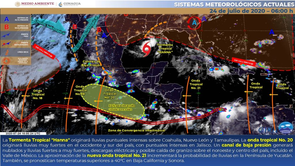Las condiciones predominantes de estos días estarán asociadas al flujo constante de humedad proveniente del Pacífico y el Golfo de México, además de los efectos de la persistente línea de vaguada superficial extendida desde el noroeste hasta el centro-sur del país.