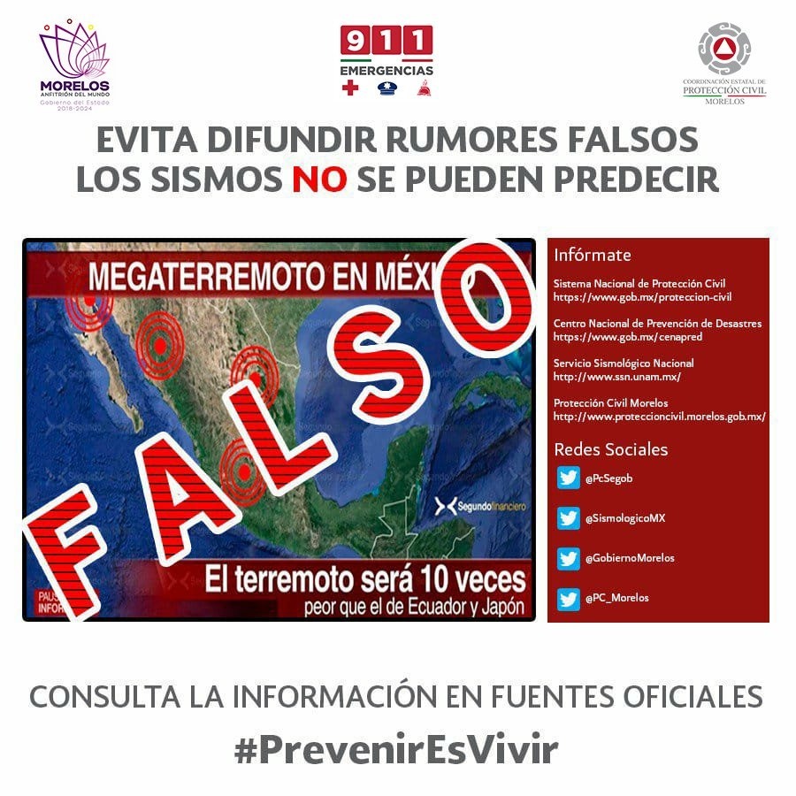 Tras la actividad sísmica registrada en los últimos días en el país, la Coordinación Estatal de Protección Civil Morelos (CEPCM) hace un enfático llamado a la población a evitar la creación o difusión de información que no provenga o cuente con el soporte oficial de las autoridades correspondientes.