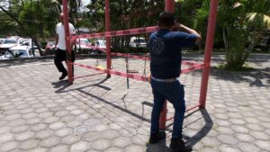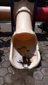Entre las observaciones realizadas en columpios, sube y baja y un juego de gusano con tobogán, se observó juegos con piezas oxidadas, partes rotas y desgastadas, falta de tornillería y otros elementos de desgaste, por lo que se procedió a suspenderlos de manera temporal colocando sellos y un acordonamiento con tiras de peligro para que no sean utilizados hasta en tanto se reparen o sustituyan.