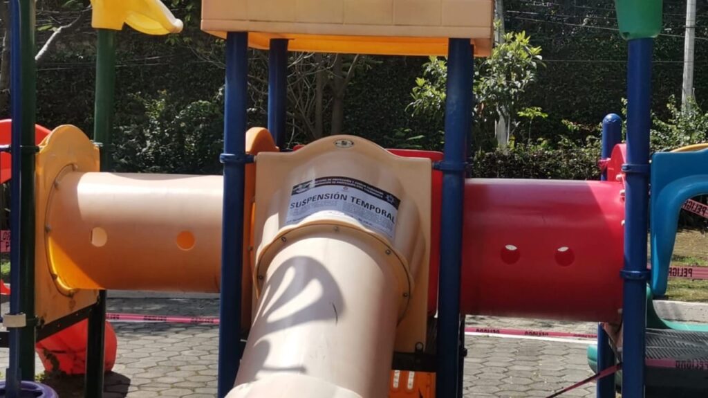Entre las observaciones realizadas en columpios, sube y baja y un juego de gusano con tobogán, se observó juegos con piezas oxidadas, partes rotas y desgastadas, falta de tornillería y otros elementos de desgaste, por lo que se procedió a suspenderlos de manera temporal colocando sellos y un acordonamiento con tiras de peligro para que no sean utilizados hasta en tanto se reparen o sustituyan.