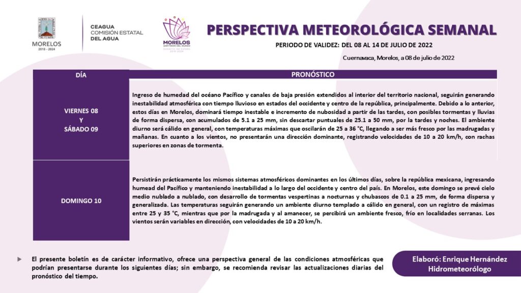 La Comisión Estatal del Agua (Ceagua) informa que debido al ingreso de humedad del Océano Pacífico y canal de baja presión extendido a lo largo del Occidente y Centro de la República se pronostica para este fin de semana tiempo inestable con posibilidad de tormentas vespertinas a nocturnas y un ambiente cálido durante el día.