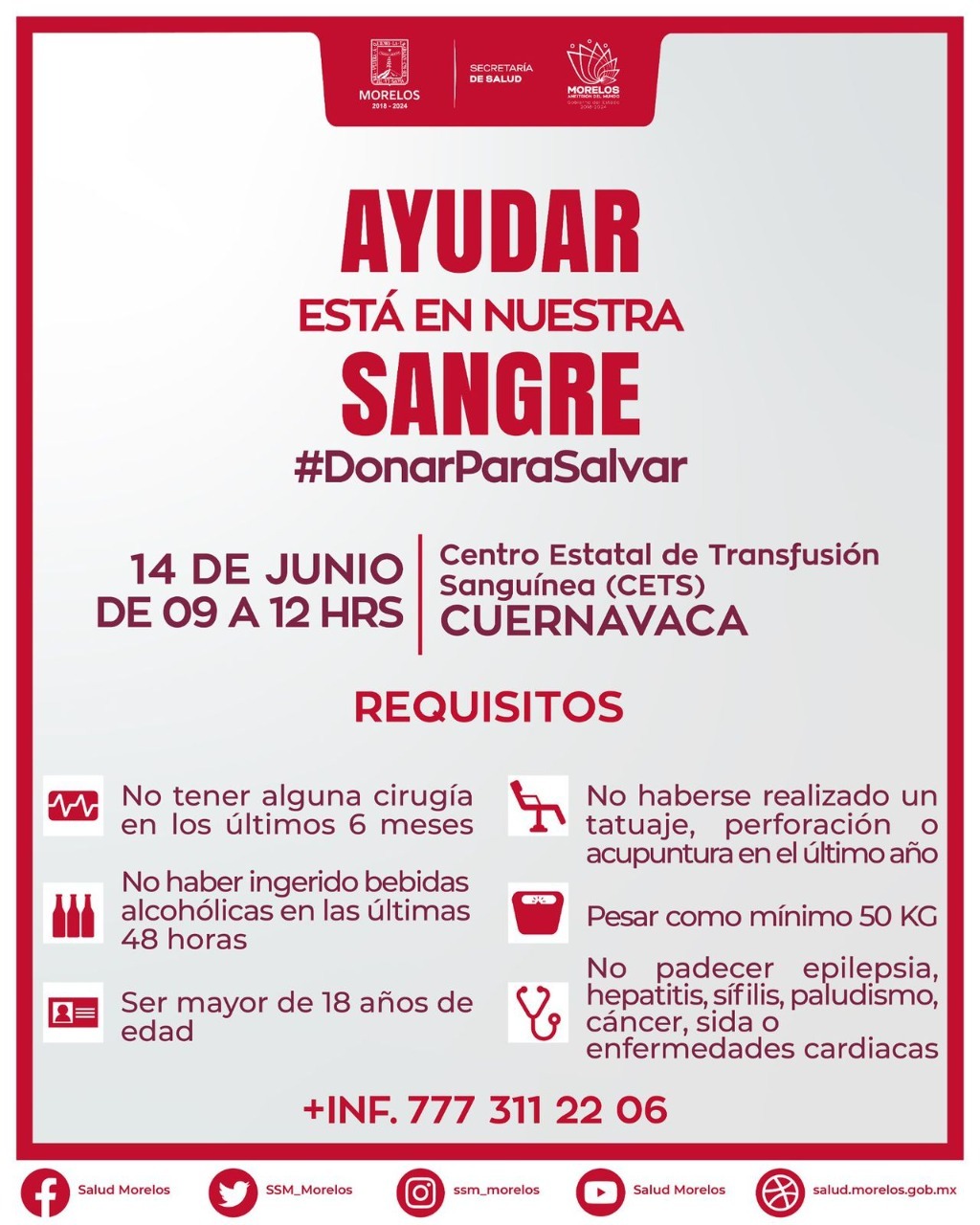El Gobierno de Morelos, a través de la Secretaría de Salud y Servicios de Salud de Morelos (SSM), llamó a la población a sumarse a la campaña permanente “Ayudar está en nuestra sangre”, que permite fomentar el altruismo y solidaridad entre la población para salvar vidas.