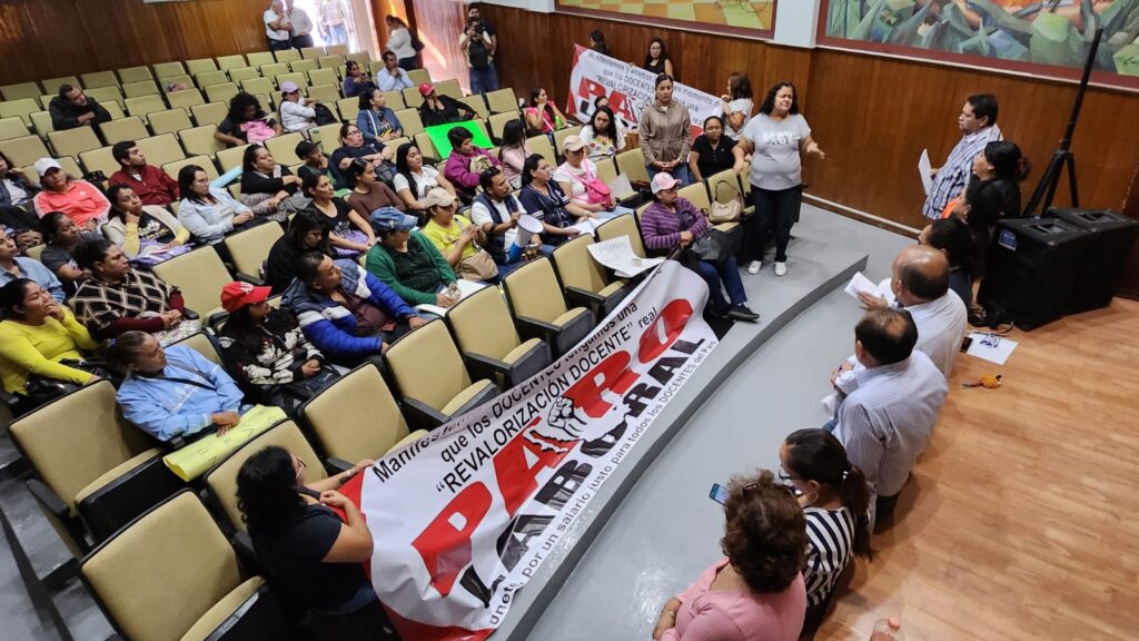 Reunidos en el auditorio de la Sección 19, los docentes reclamaron ante el secretario general Joel Sánchez Ayala y la cúpula sindical la falta de ajuste salarial de por lo menos 17 mil trabajadores de la educación, prometida por el presidente Andrés Manuel López Obrador.