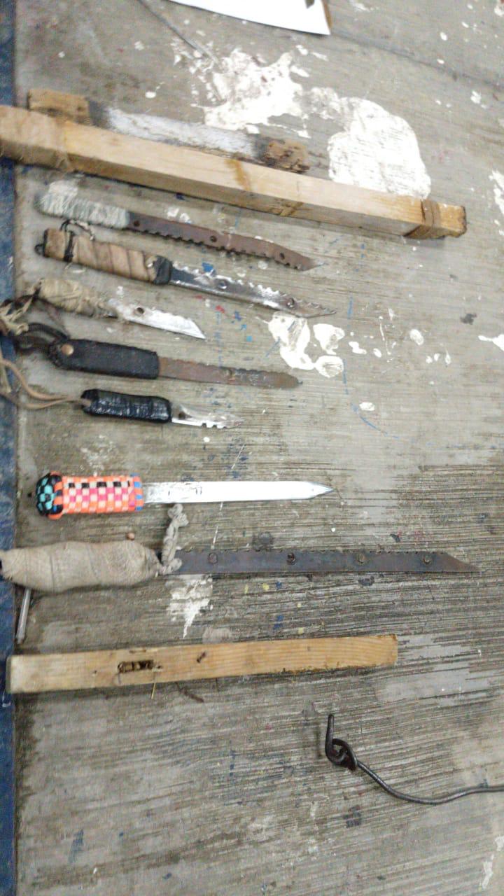 Fue aproximadamente a las 00:40 horas de este día, que el personal realizó revisiones en el área del dormitorio, así como áreas comunes, en donde se decomisaron 18 puntas metálicas hechizas de diferentes tamaños, 8 palos de madera de distintos tamaños, 3 tubos metálicos y 4 varillas de metal, las cuales fueron puestas a disposición de la autoridad competente.