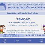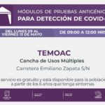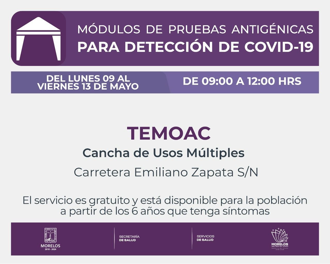 Brigadas de Servicios de Salud de Morelos (SSM) anunciaron que del lunes 09 al viernes 13 de mayo 2022, el módulo de pruebas antigénicas para detección de COVID-19, a adultos y menores de edad, estará disponible en el municipio de Temoac.