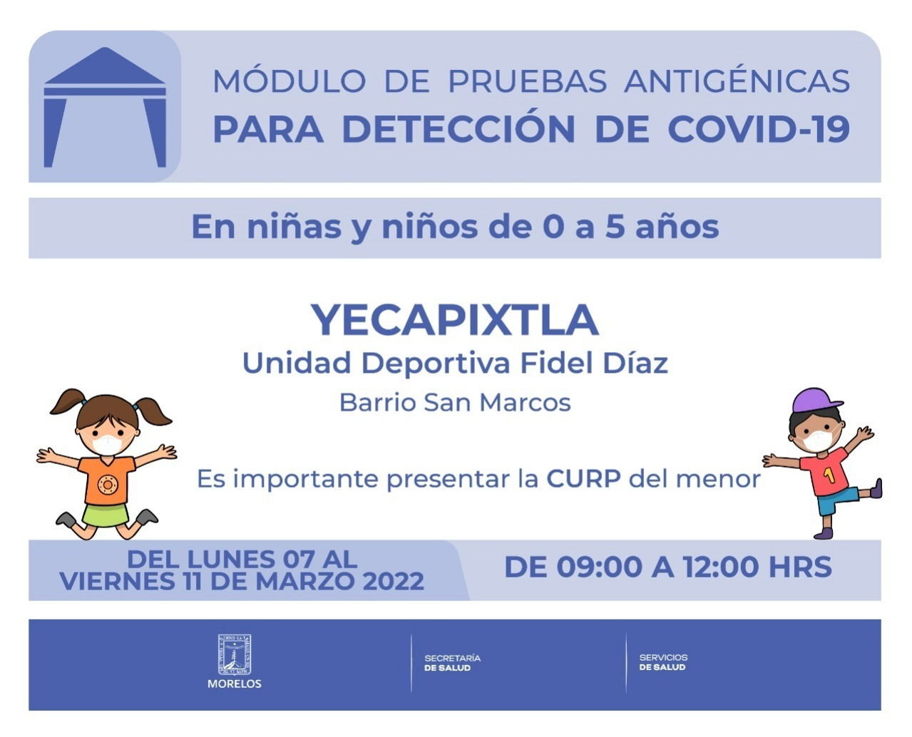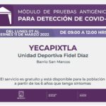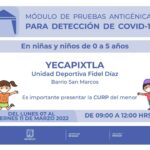 Las pruebas de antígeno para niñas y niños de cero a cinco años, así como para toda la población estarán ubicadas en la Unidad Deportiva Fidel Díaz, en el Barrio San Marcos, en Yecapixtla.