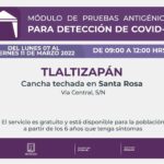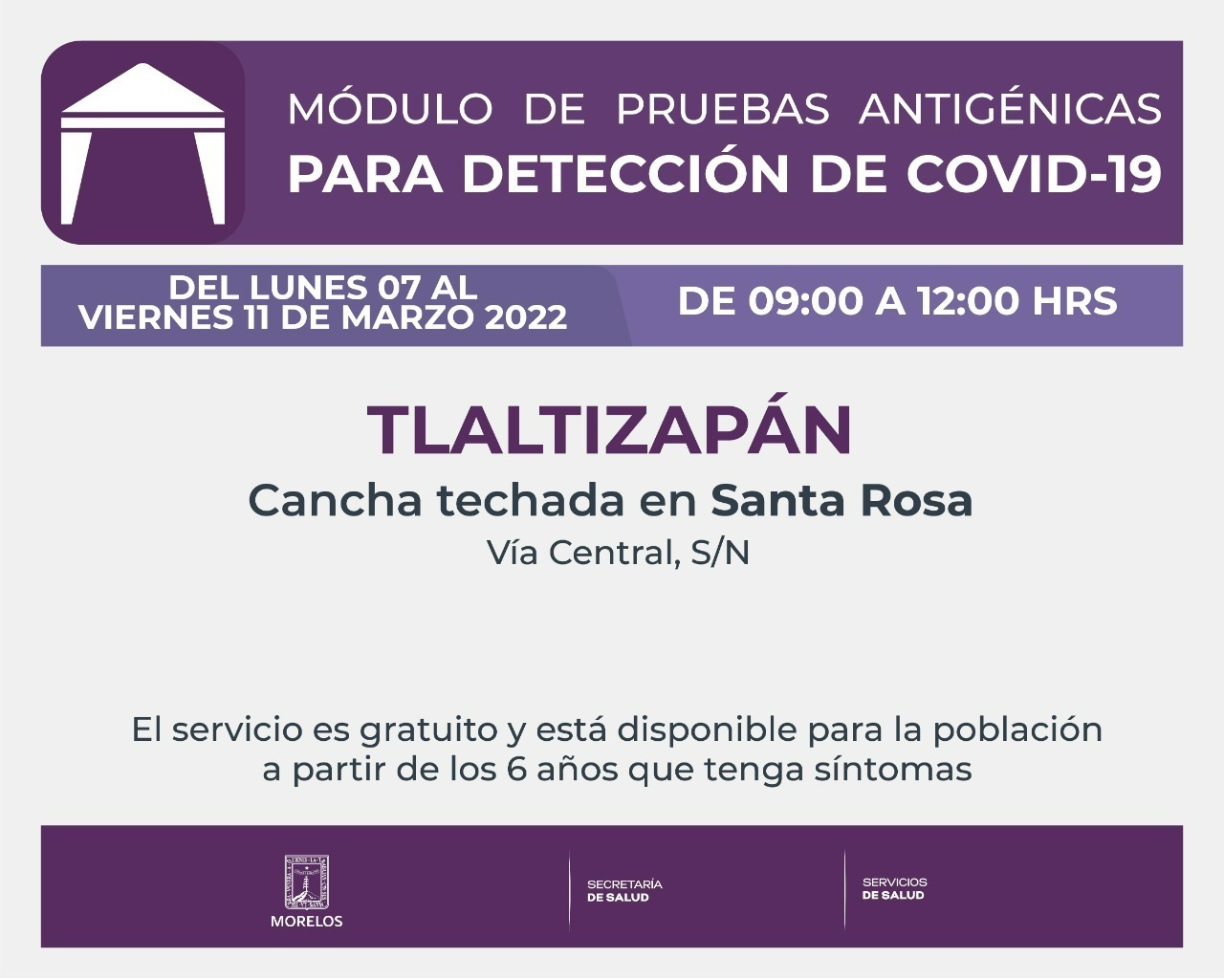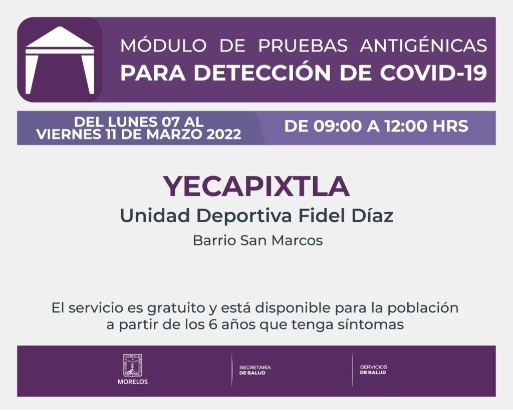 El Gobierno estatal, a través de la Secretaría de Salud y Servicios de Salud de Morelos (SSM), anunció que del lunes 07 al viernes 11 de marzo, instalará los módulos de pruebas antigénicas para la detección de COVID-19 en los municipios de Yecapixtla, Tlaltizapán y Mazatepec.