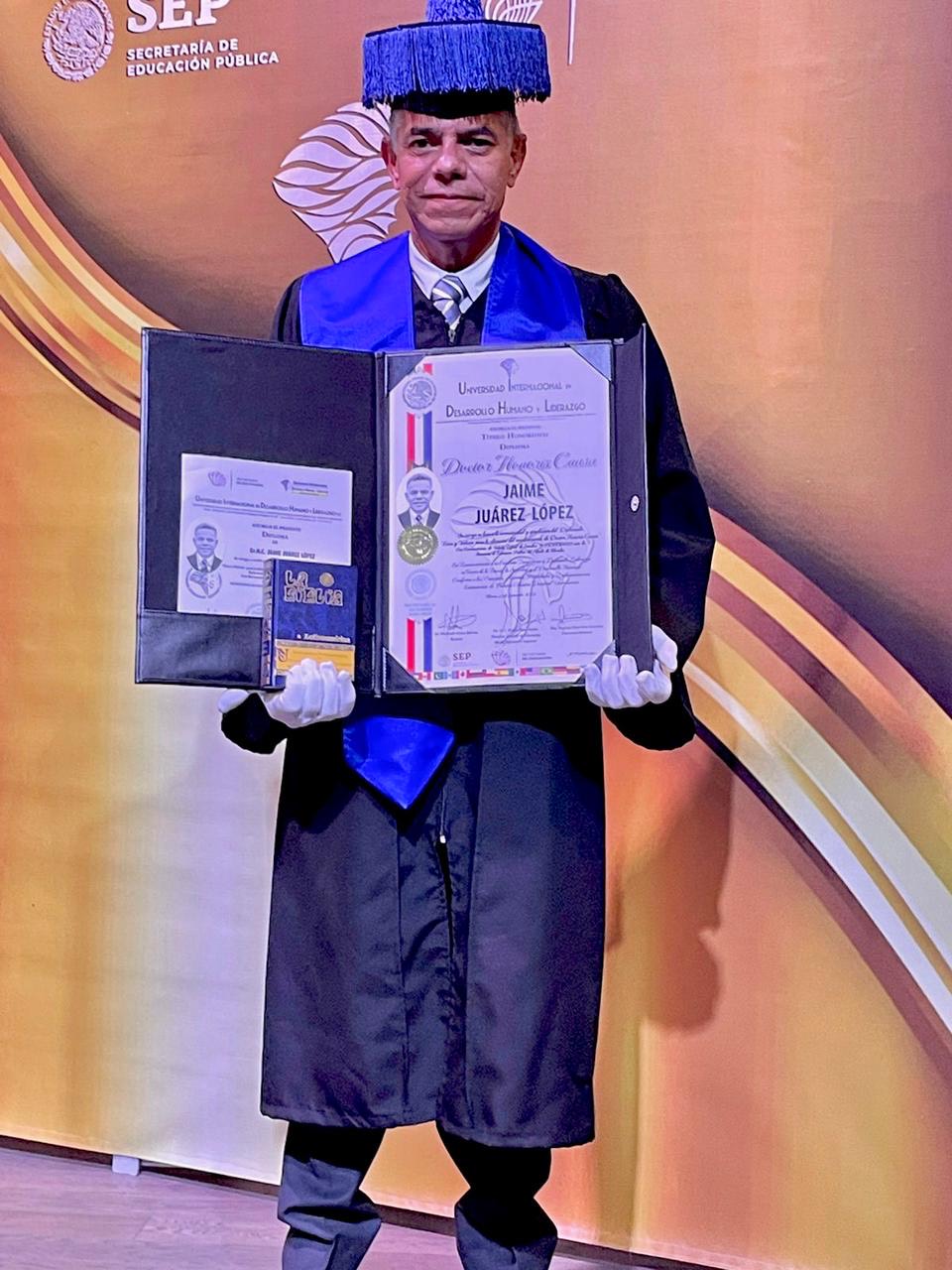 El titular de la Comisión Estatal del Agua (Ceagua), Jaime Juárez López, fue investido Doctor Honoris Causa por la Universidad Internacional de Desarrollo Humano y Liderazgo (UIDHL) como parte del reconocimiento a su trayectoria profesional y desenvolvimiento en el ámbito de la función pública, específicamente, en el sector hidráulico.