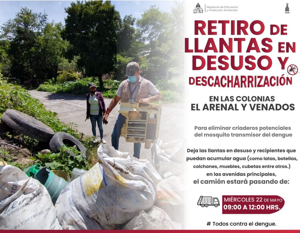 Deja las llantas en desuso y recipientes que puedan acumular agua (como latas, botellas, colchones, muebles, cubetas entre otros), en las avenidas principales.