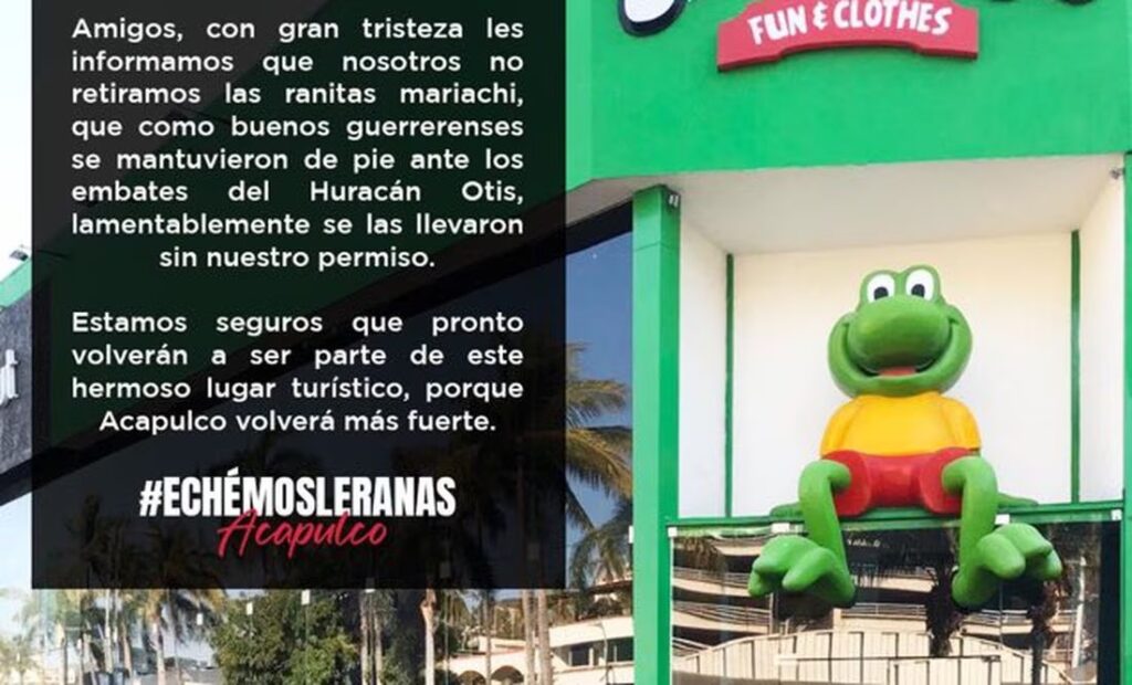 La icónica tienda de ropa y accesorios en la costera Miguel Alemán confirmó el robo de las adoradas figuras de las ranitas que alegraban nuestras calles. Estas simpáticas criaturas se habían convertido en el alma de la ciudad, conquistando tanto a turistas como a locales.