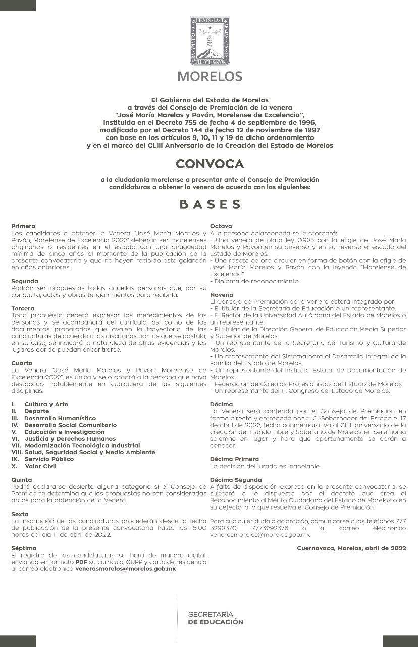 El Gobierno del Estado de Morelos, a través de la Secretaría de Educación, y en el marco del CLIII aniversario de la creación del Estado Libre y Soberano de Morelos, abrió la convocatoria a participar por la Venera “José María Morelos y Pavón, Morelense de Excelencia”.