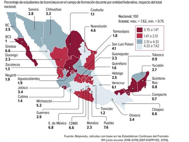 En estados como Coahuila, por ejemplo, sólo se forma a 1.1% de los futuros maestros; en Zacatecas, a 1.3%, y en Colima, a 1.4 por ciento.