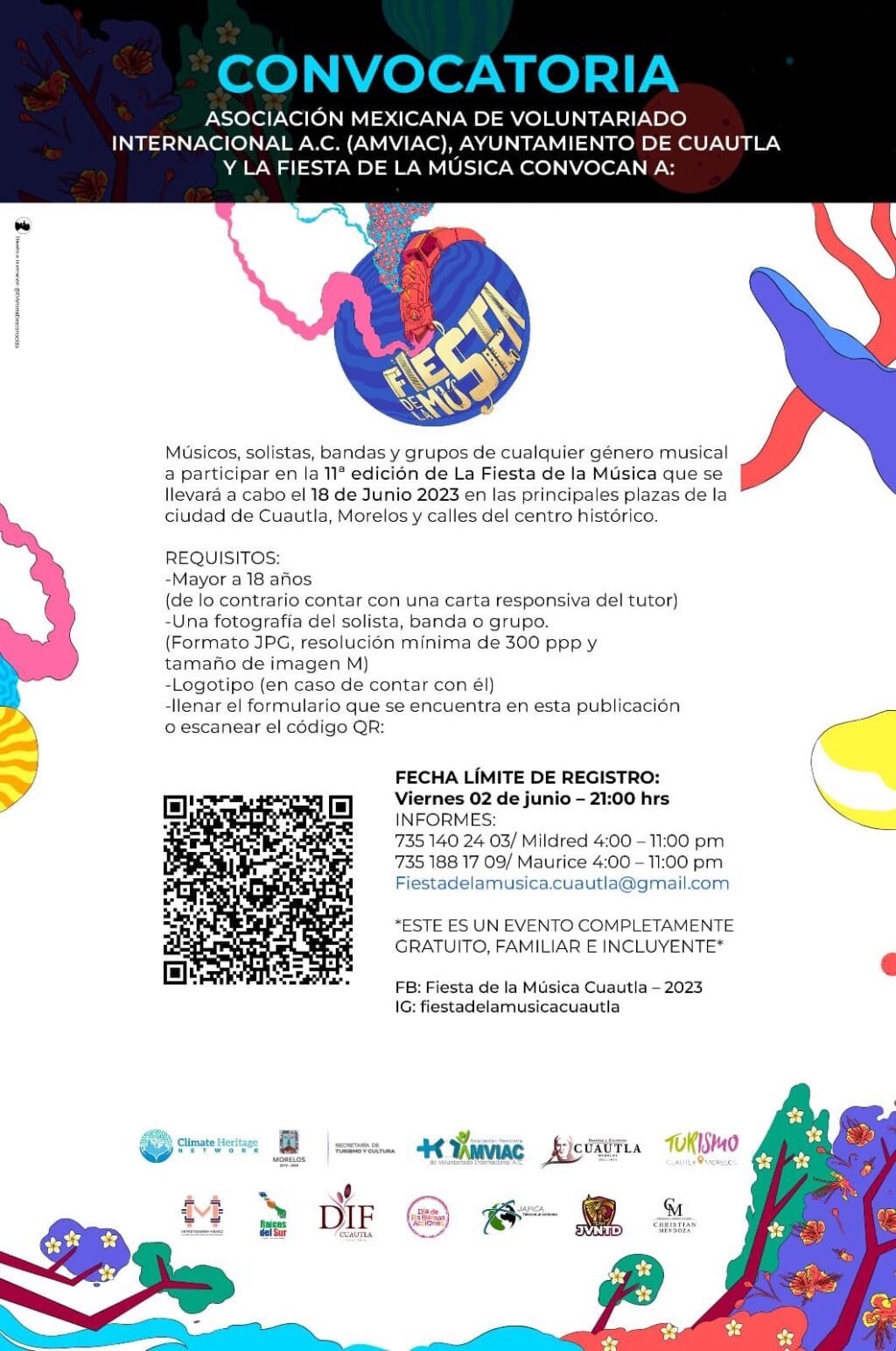 La convocatoria para quienes deseen participar ya fue lanzada y tendrán hasta el 02 de junio para que se registren todos aquellos que deseen ser parte de la Fiesta de la Música, podrán enviar sus solicitudes a fiestadelamusica.cuautla@gmail.com
