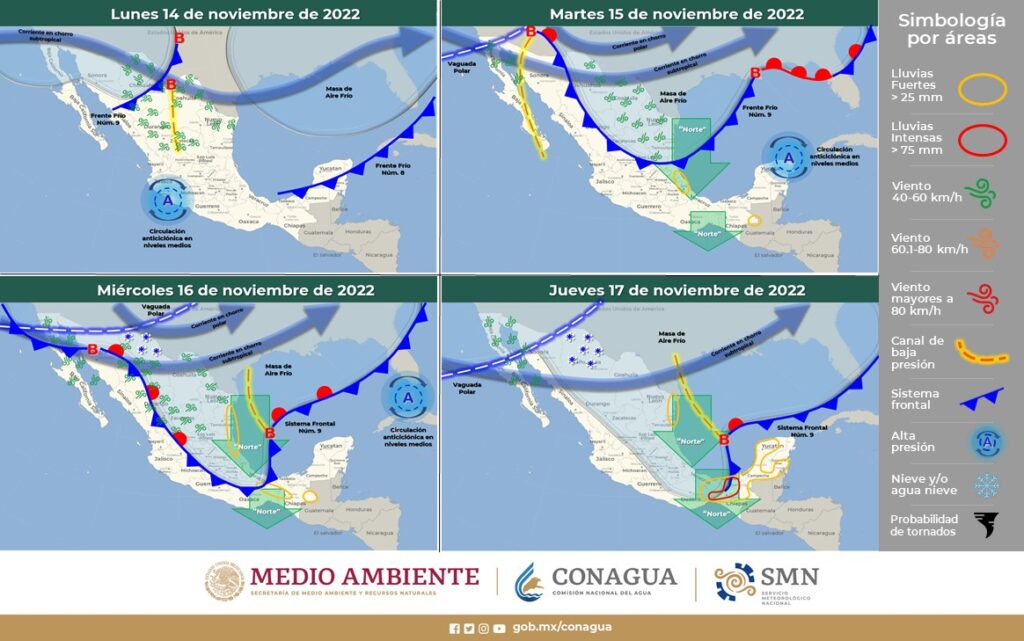 Nuevo frente frío número 9 se desplazará a través del Golfo de México, lo que favorecerá tiempo lluvioso en estados de dicha vertiente, mientras que, en el resto del territorio nacional, persistirán condiciones estables, con bajo potencial para lluvias y ambiente matutino fresco.