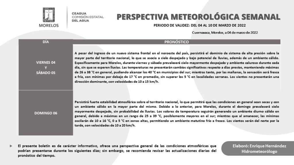 La Comisión Estatal del Agua (Ceagua) informa que para el primer fin de semana de marzo en Morelos se prevé tiempo estable, con cielo despejado y ambiente cálido a caluroso durante el día y temperaturas frescas por las mañanas.