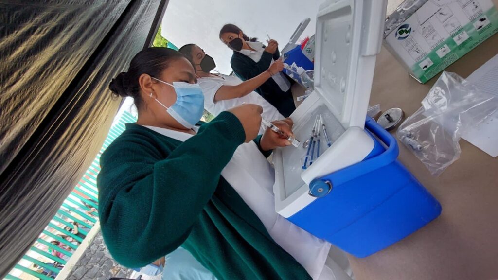 En las sedes de los Centros de Seguridad Social del Instituto Mexicano del Seguro Social (IMSS), ubicadas en las colonias Centro y Civac, personal del Gobierno de México colocó la vacuna de Pfizer-BioNtech para los menores.
