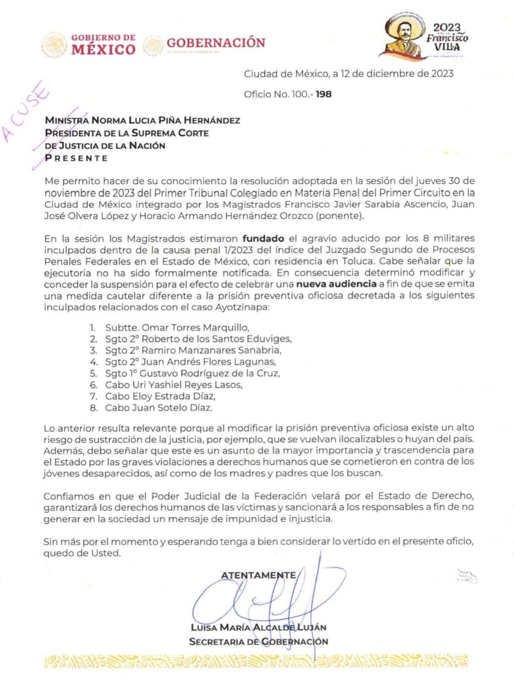 La secretaria de Gobernación, Luisa María Alcalde, publicó en redes sociales la misiva que mandó el 12 de diciembre a la presidenta de la Suprema Corte, Norma Piña, sobre el caso de los jóvenes desaparecidos desde septiembre de 2014 en el estado de Guerrero.