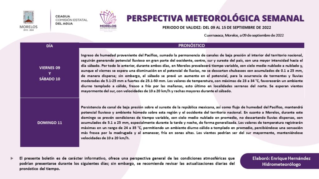 La Comisión Estatal del Agua (Ceagua) replica la información que emite el Servicio Meteorológico Nacional (SMN), referente a las temperaturas para el segundo fin de semana de septiembre de 2022, en el que persistirá el ingreso de humedad proveniente del Pacífico, sumado a la permanencia de canales de baja presión al interior del territorio nacional, generando potencial lluvioso en gran parte del occidente, centro, sur y sureste del país.