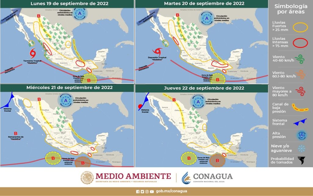 El ciclón tropical “Madeline” continuará desplazándose frente a la costa occidental del territorio nacional, lo que, sumado a canales de baja presión en el Golfo de México e interior del país, mantendrá inestabilidad y desarrollo de tormentas y lluvias en diversos estados del territorio nacional.