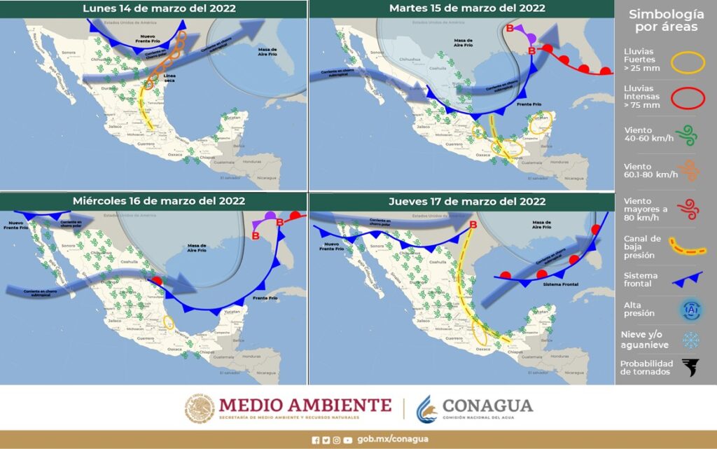 Finalmente, para los días miércoles y jueves (principalmente el miércoles), se espera cielo medio nublado a nublado, con posibles lluvias dispersas vespertinas en un rango de 0.1 a 20 mm. El ambiente vespertino será templado a cálido, con temperaturas máximas de hasta 37 °C; aunque por las madrugadas y mañanas, la sensación será fría, con mínimas que no rebasarán los 15 °C, menores a 5 °C en localidades serranas. Los vientos no presentarán una dirección dominante, manteniendo velocidades de 15 a 25 km/h.