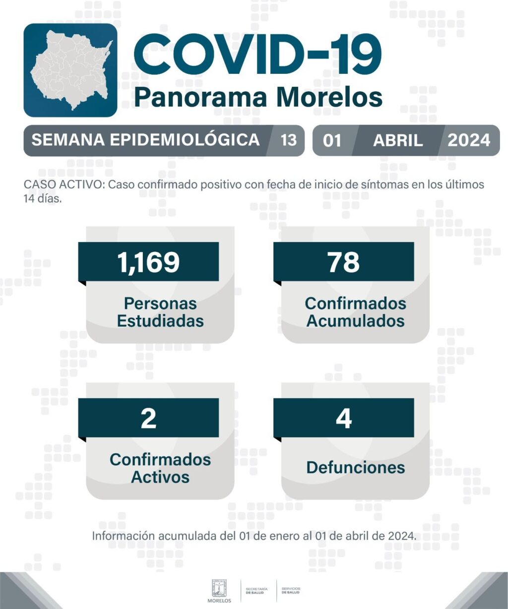 Al corte de la semana epidemiológica 13, Morelos reporta 1,169 personas estudiadas de manera acumulada; 78 casos positivos de COVID-19; 2 casos activos y 4 defunciones.