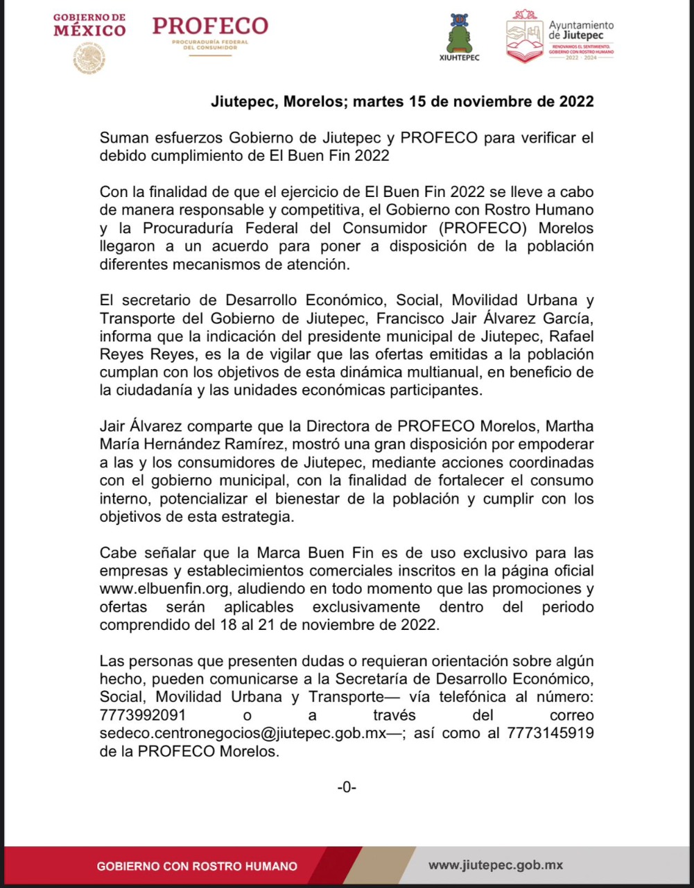 Con la finalidad de que el ejercicio de El Buen Fin 2022 se lleve a cabo de manera responsable y competitiva, el Gobierno con Rostro Humano y la Procuraduría Federal del Consumidor (PROFECO) Morelos llegaron a un acuerdo para poner a disposición de la población diferentes mecanismos de atención.