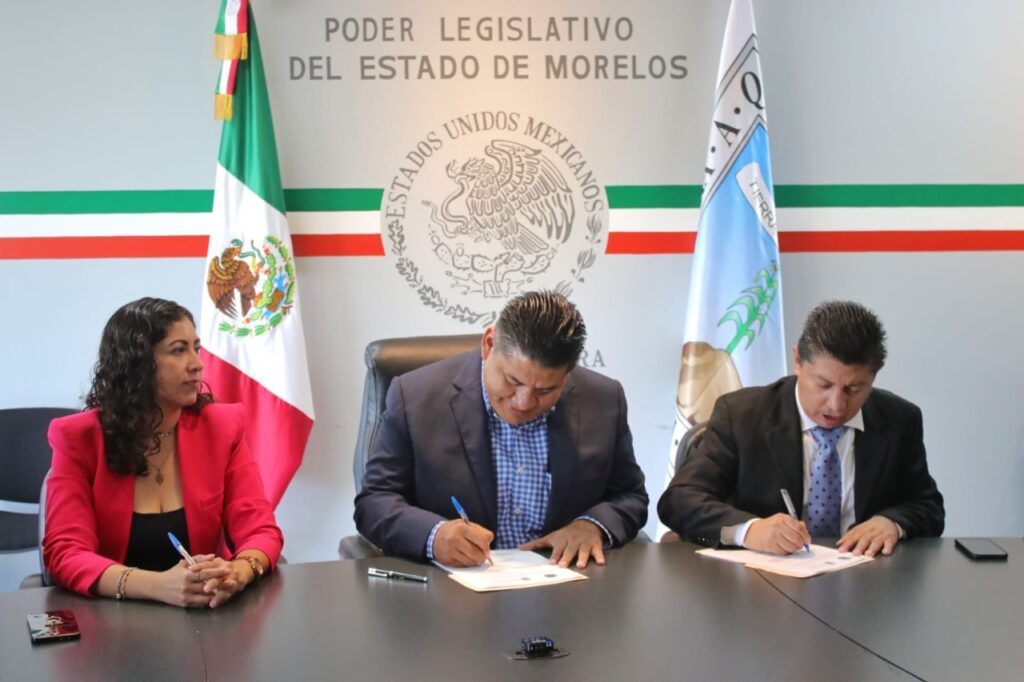 El diputado Francisco Erik Sánchez Zavala, en su calidad de presidente de la Mesa Directiva del Congreso del estado, suscribió, a nombre de la LV Legislatura, un convenio de colaboración con la Barra de Abogados Electorales de Morelos AC, encabezada por su presidente, Gilberto González Pacheco.