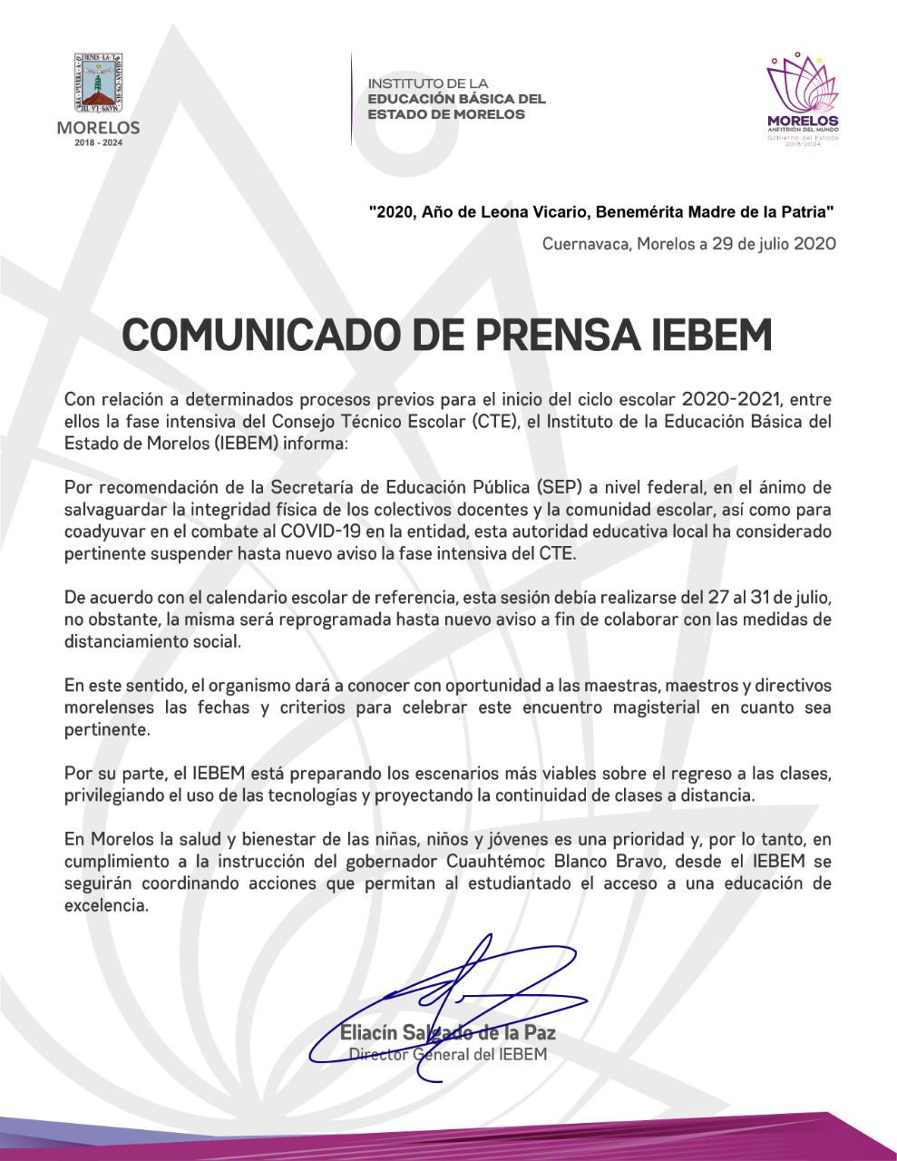 Con relación a determinados procesos previos para el inicio del ciclo escolar 2020-2021, entre ellos la fase intensiva del Consejo Técnico Escolar (CTE), el Instituto de la Educación Básica del Estado de Morelos (IEBEM) informa: