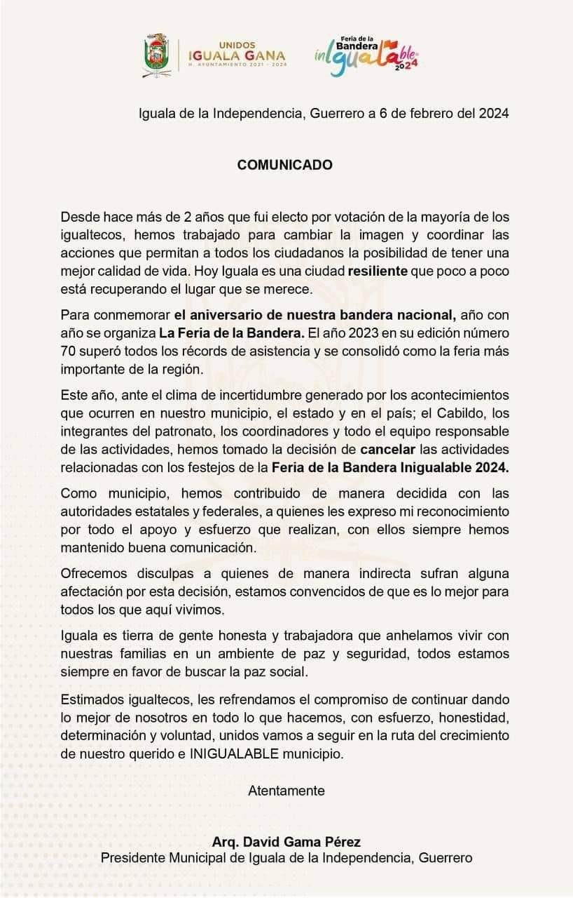 A través de un comunicado, el presidente municipal de #Iguala, David Gama Pérez informa que, ante el grave clima de violencia e #inseguridad que prevalece en el municipio y en el estado de #Guerrero, suspenderán los festejos de la Feria Nacional de la Bandera.
