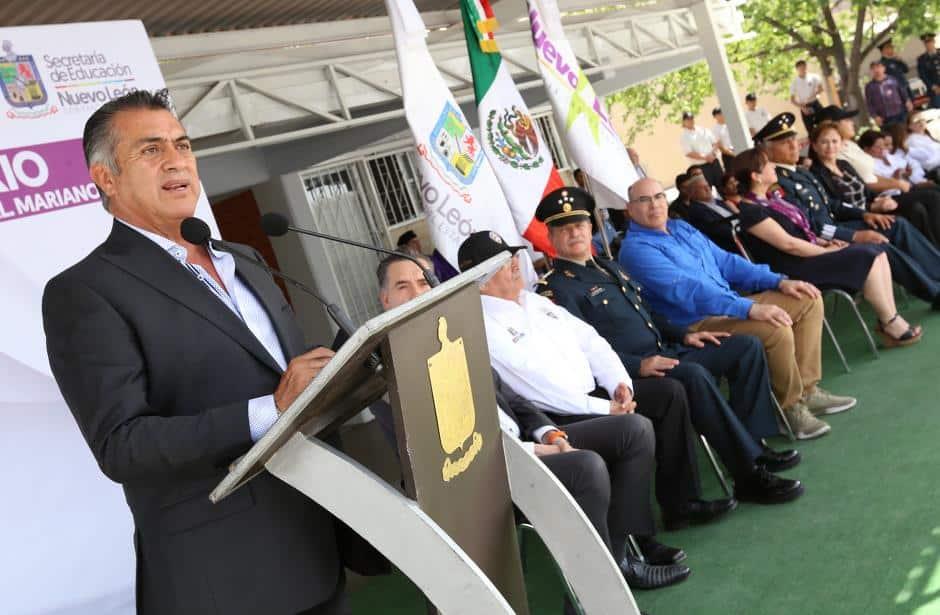 Durante la ceremonia por el segundo aniversario del Colegio de Bachilleres «Mariano Escobedo», que se llevó a cabo en el plantel del municipio de San Nicolás, «El Bronco» finalizó su discurso diciendo a los estudiantes que le comenta a Dios sus problemas y a veces le contesta.