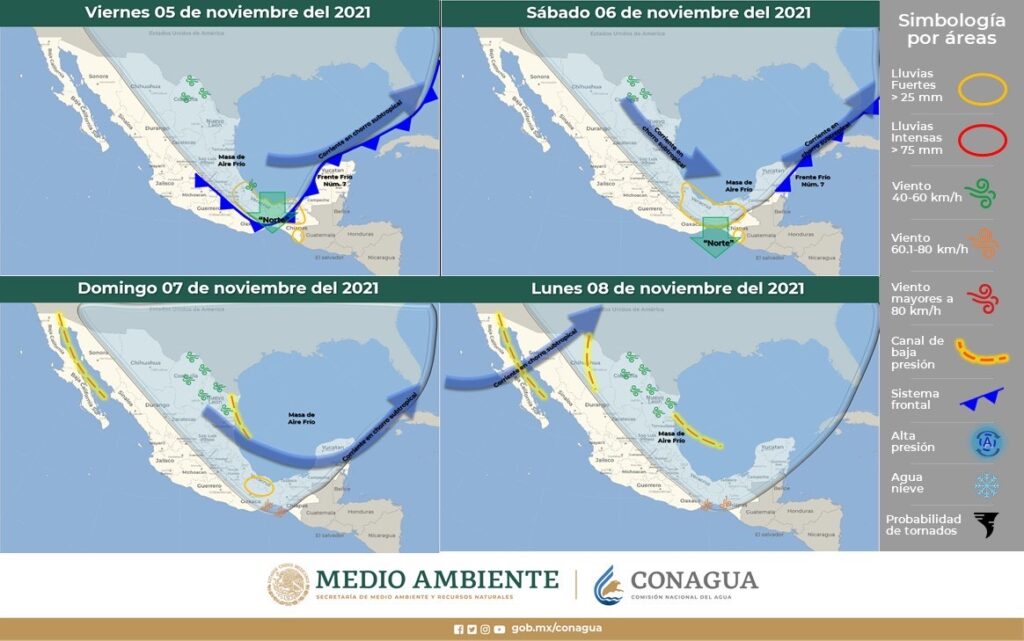 La Comisión Estatal del Agua (Ceagua) informa que debido al sistema de alta presión que da impulso al frente frío no. 7, sobre el territorio nacional, prevalecerá fuerte estabilidad y bajo contenido de humedad sobre el mismo, exceptuando estados del este y sureste, donde se esperan precipitaciones.