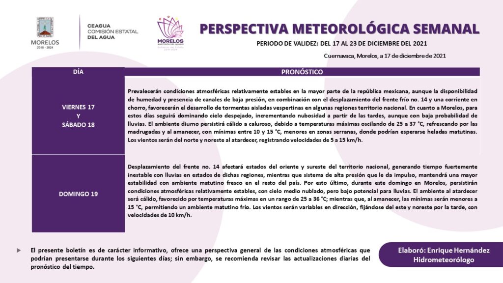 La Comisión Estatal del Agua (Ceagua) informa que para el fin de semana del 17 al 19 de diciembre se prevé bajo potencial de lluvias, ambiente cálido a caluroso durante la tarde en gran parte de territorio morelense y bajas temperaturas al amanecer.