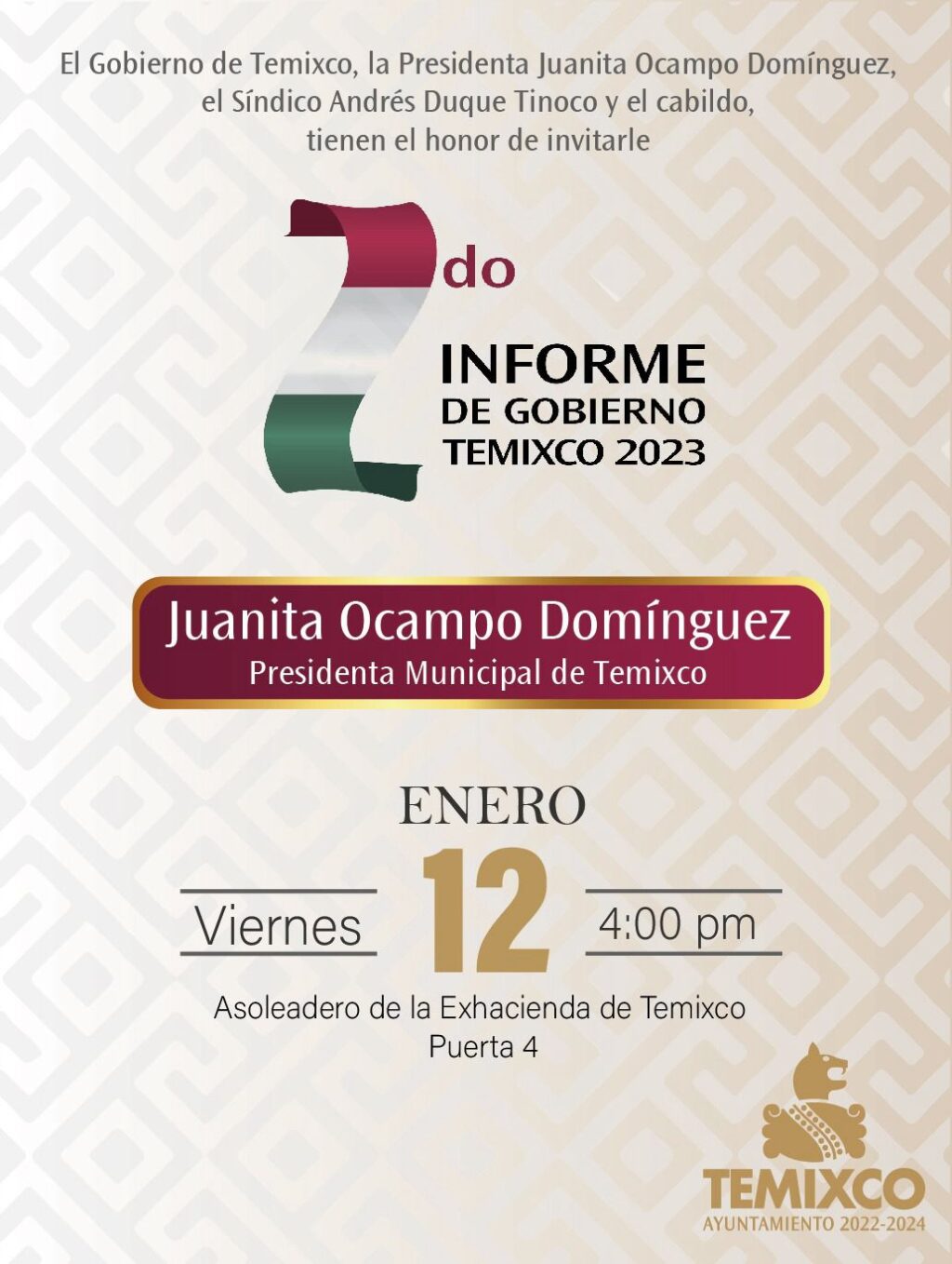 El gobierno de Temixco, la presidenta municipal Juanita Ocampo Domínguez, el síndico municipal e integrantes del Cabildo realizarán una sesión Solemne este próximo viernes 12 de enero del presente año para la Rendición de Cuentas como parte del segundo año de actividades de la actual administración 2022-2024, de acuerdo a la logística planeada la recepción para invitados especiales y público en general es a partir de las 4 de la tarde en el Asoleadero de la ex Hacienda de Temixco para ingresar por la puerta 4.