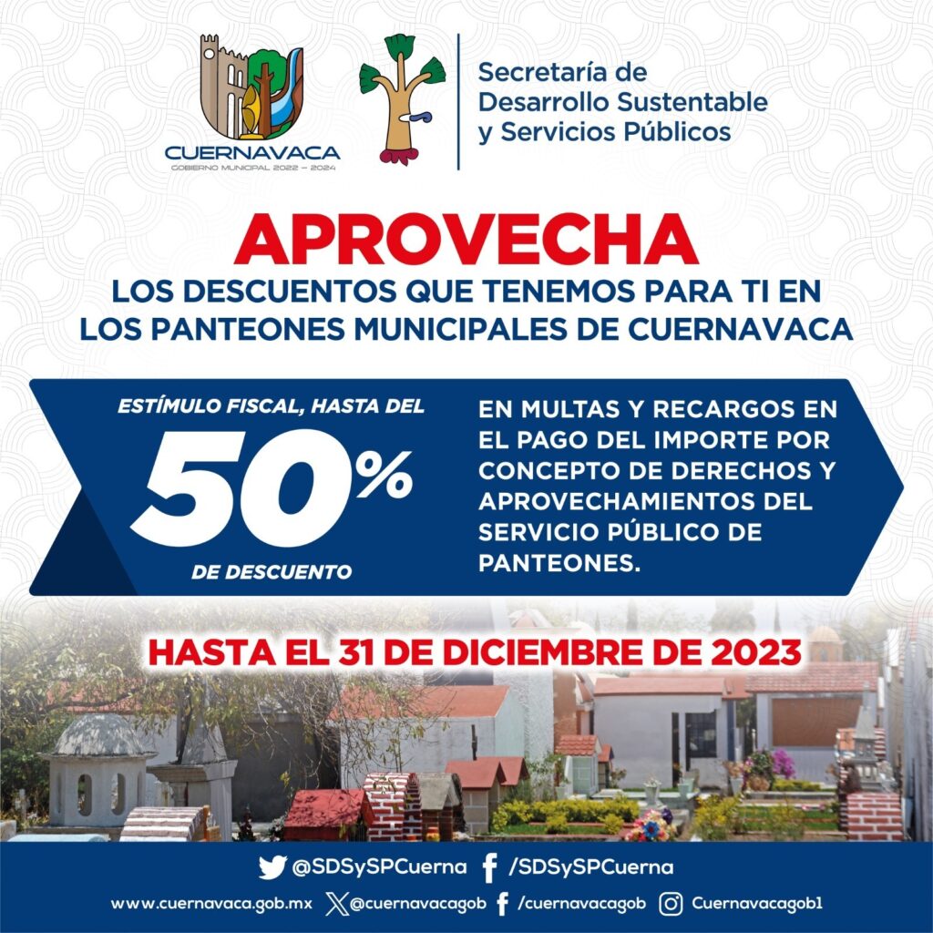 Con el objetivo de seguir apoyando la economía familiar e incentivar a la ciudadanía para regularizarse en cuanto al servicio público de panteones, el Cabildo del Ayuntamiento de Cuernavaca aprobó un estímulo fiscal de hasta un 50 por ciento de descuento en el pago de multas y recargos por este concepto, generados hasta la aprobación del acuerdo, teniendo una vigencia al 31 de diciembre del 2023.