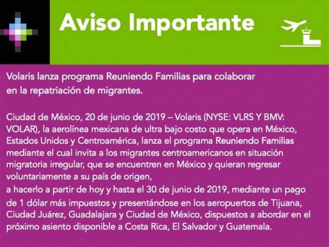 En su cuenta de Twitter, la aerolínea invita a los migrantes centroamericanos en situación migratoria irregular, que se encuentran en México y quieran regresar voluntariamente a su país de origen, a hacerlo a partir de hoy y hasta el 30 de junio de 2019, mediante un pago de 1 dólar, más impuestos, presentándose en los aeropuertos de Tijuana, Ciudad Juárez, Guadalajara y Ciudad de México.